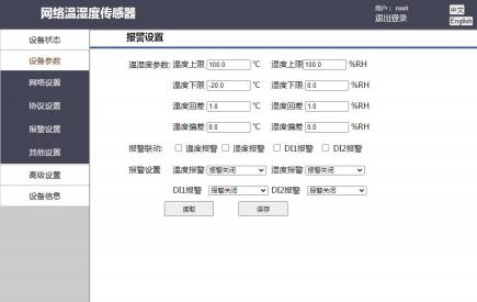 用戶在該頁(yè)面可以設(shè)置溫度、濕度上下限報(bào)警閾值、報(bào)警回差值,用戶可以自由選擇是否開(kāi)啟報(bào)警以及報(bào)警觸發(fā)條件,同時(shí)在該頁(yè)面用戶可以選擇報(bào)警是否需要聯(lián)動(dòng)繼電器,如果選擇聯(lián)動(dòng),那么報(bào)警觸發(fā)時(shí),繼電器將會(huì)工作。