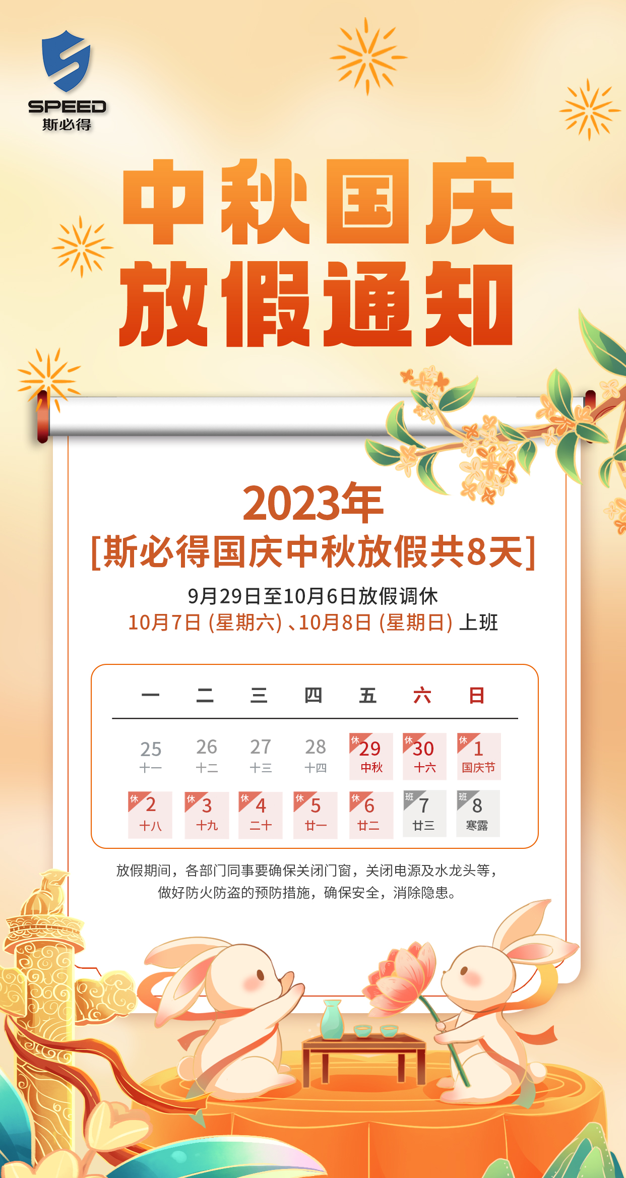 根據(jù)國(guó)務(wù)院辦公廳通知精神,現(xiàn)將2023年中秋節(jié)、國(guó)慶節(jié)放假安排通知如下:2023年9月29日(星期五)至10月6日(星期五)放假調(diào)休,共8天。10月7日(星期六)、10月8日(星期日)上班。