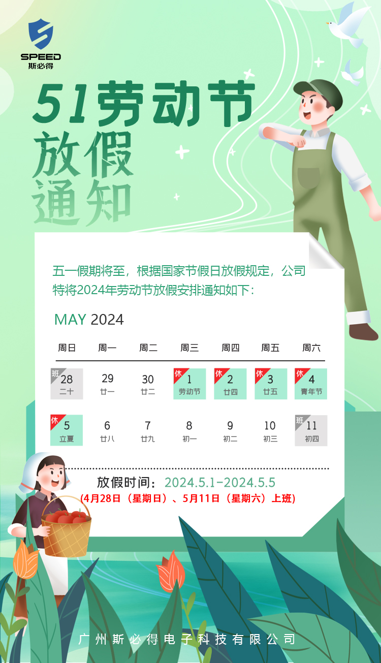 根據(jù)相關政策,結(jié)合我司實際情況,就2024年五一勞動節(jié)做調(diào)休放假安排如下,假期期間涉及項目設備的發(fā)貨、安裝、調(diào)試等事項均要提前安排,做好對接,特殊情況的需要單獨安排。