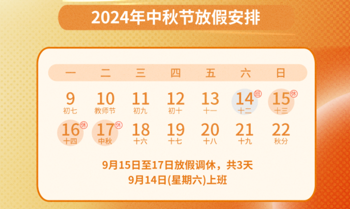 根據(jù)國(guó)家節(jié)假日安排,結(jié)合我司實(shí)際情況,中秋節(jié)假期定于9月15日至9月17日(共計(jì)3天),9月18日(星期三)恢復(fù)正常上班。請(qǐng)各位同事提前做好工作對(duì)接,確保假期期間公司業(yè)務(wù)的平穩(wěn)運(yùn)行。